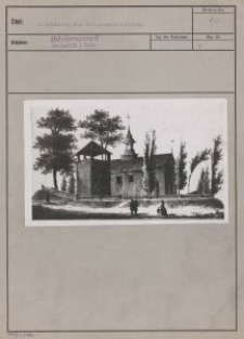 1 fot. ; 10,8x17,8 cm ; Fotografia przyklejona do szarej karty Archiv Ostlandbild ; Pod tytułem z lewej strony w polu Urheber: "Urhebervermerk Ostlandbild/Rode" ; Tytuł z karty archiw. (pole Titel) ; W polu Neg.-Nr.: "R" ; W polu Archiv-Nr.: 10 ; Fotografia przedstawia drewniany kościół Wniebowzięcia NMP (po przeniesieniu budynku na ul. Ogrodową 22 - św. Józefa) z dzwonnicą na ob. pl. Kościelnym. Dookoła świątyni ogrodzenie, drzewa oraz przechodnie ; Fotografia pochodzi z Archiwum Ostlandbild współtworzonego przez A. Kissa i W. Rodego w latach 1939-1945 w Łodzi
