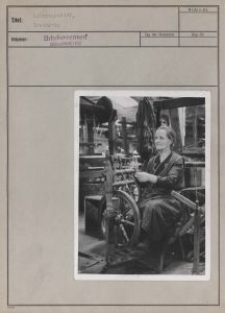 1 fot. ; 17,9x12,9 cm ; Fotografia przyklejona do szarej karty Archiv Ostlandbild ; Pod tytułem z lewej strony w polu Urheber: "Urhebervermerk Ostlandbild/Kiß" ; Tytuł z karty archiw. (pole Titel) ; Fotografia przedstawia kobietę przędącą przy kołowrotku. W tle ręczny warsztat tkacki ; Fotografia pochodzi z Archiwum Ostlandbild współtworzonego przez A. Kissa i W. Rodego w latach 1939-1945 w Łodzi