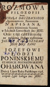Title: Rozmowa o filozofii / przez Michała Drużbackiego skarbnikowicza podolskiego napisana a przy dokończeniu filozofii w szkołach lwowskich S. J. oraz z tąż całą filozofią na publiczną dysputę wystawiona jaśnie wielm. jego mści panu Janowi Łodzi Ponińskiemu staroście piotrkowskiemu ofiarowana, dnia 8 lipca Roku P. 1746.